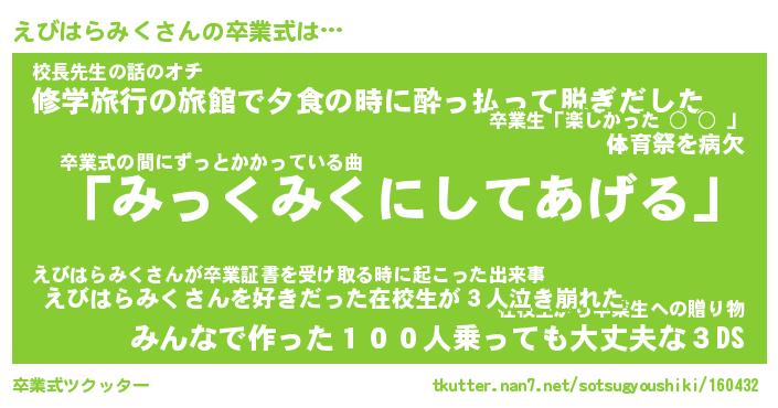 | 胡散臭い通販商品みたいなあだ名 | 『必ず成功するブレスレット…その名も「えびはらみく」』 |
