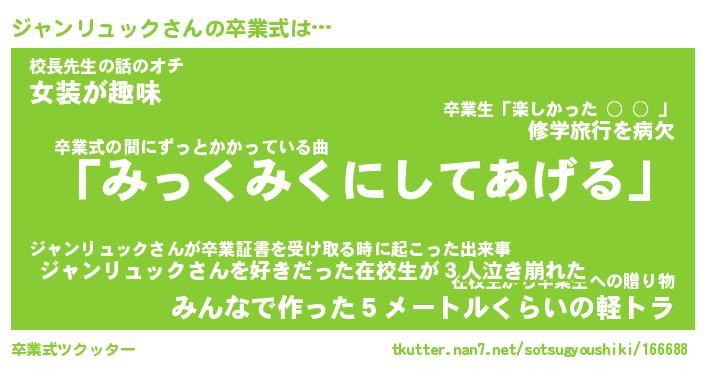 | 伝説のあだ名 | 『伝説のスナイパージャンリュック』 |