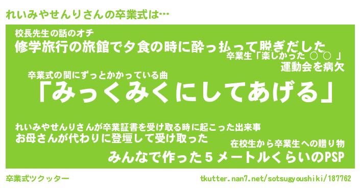 | 伝説のあだ名 | 『伝説のスナイパーれいみやせんり』 |