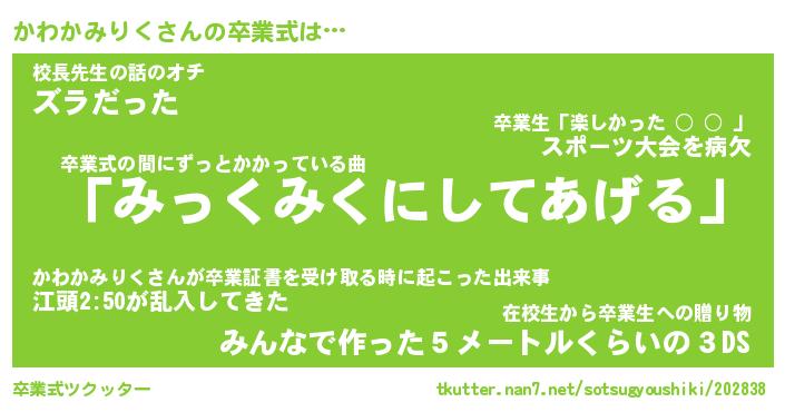 | 伝説のあだ名 | 『伝説のスナイパーかわかみりく』 |