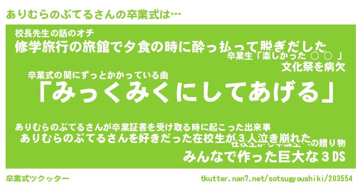 | 男性向けラノベタイトル風あだ名 | 『ありむらのぶてるの憂鬱』 |