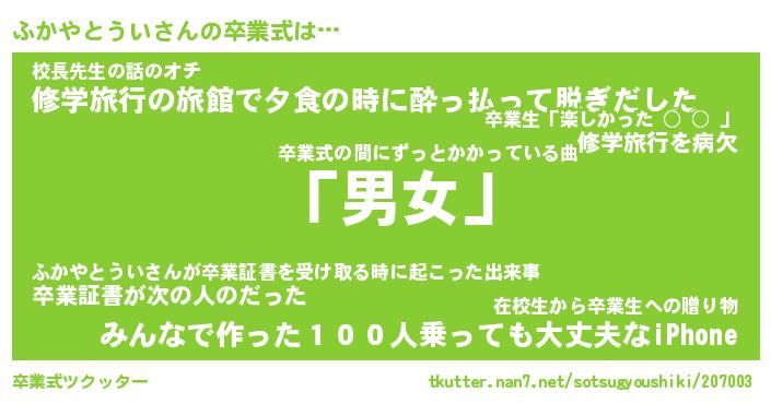 | ピコ太郎風あだ名 | 『フコ八郎』『ピフ一郎』『フカ史郎』 |