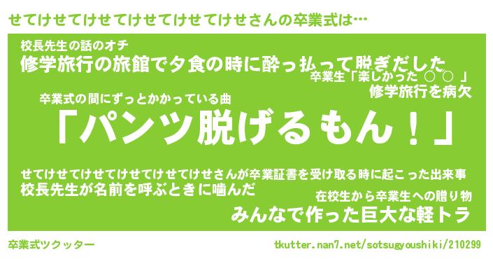 | 男性向けラノベタイトル風あだ名 | 『せてけせてけせてけせてけせてけせの憂鬱』 |