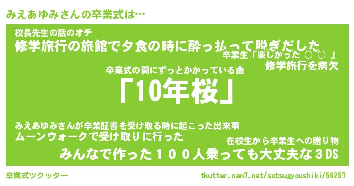 | 伝説のあだ名 | 『封印されしスナイパーみえあゆみ』 |