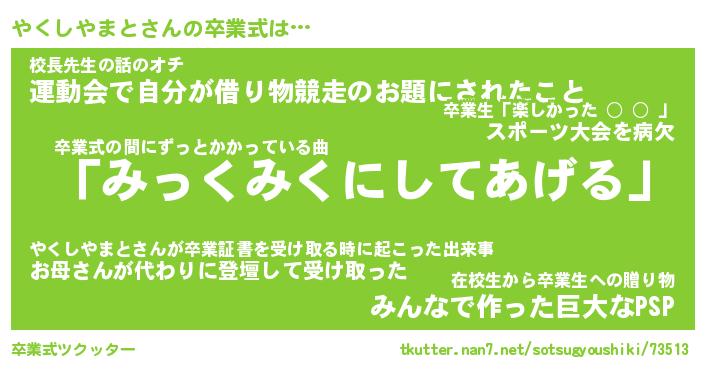 | ヘコむあだ名 | 『やくにゅー』『つくし』『やくお』 |