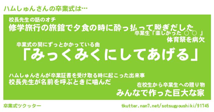 | 男性向けラノベタイトル風あだ名 | 『ハムしゅんの憂鬱』 |