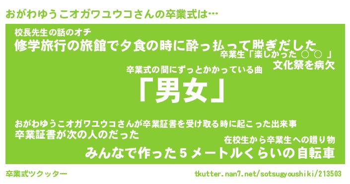 | 伝説のあだ名 | 『伝説のスナイパーおがわゆうこオガワユウコ』 |