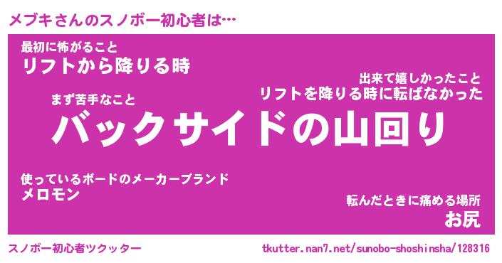 | 意味不明あだ名 | 『ペロリンメブキ』『メブキフォーエバー』 |
