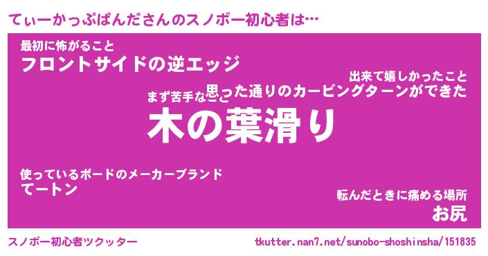 | 伝説のあだ名 | 『伝説のスナイパーてぃーかっぷぱんだ』 |