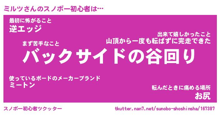 | ヘコむあだ名 | 『ミルっふぃ~』『つくし』 |