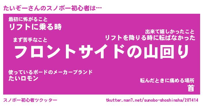 | 意味不明あだ名 | 『ペロリンたいぞー』『永久保存たいぞー』 |