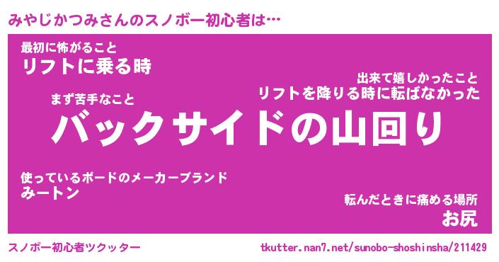 | ヘコむあだ名 | 『みやにー』『なまこ酢』『みやっぺ』 |
