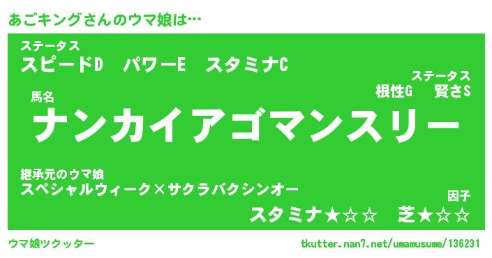 | ファンタジー風あだ名 | 『アゴフェル』『エターナルアゴキングー』 |