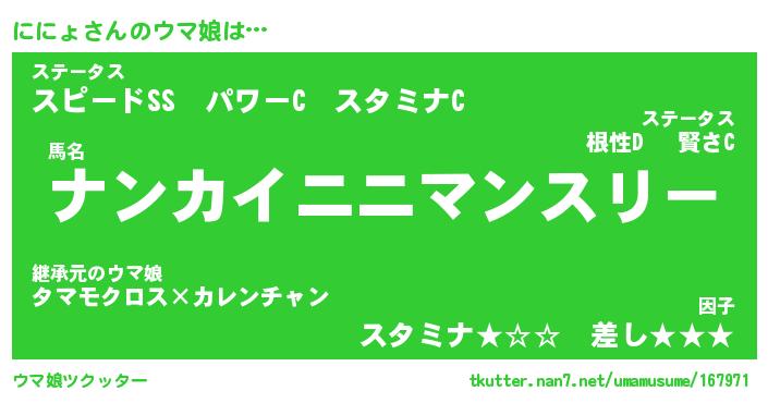 | ポケモン風あだ名 | 『ニニチュウ』『ニニョダネ』 |