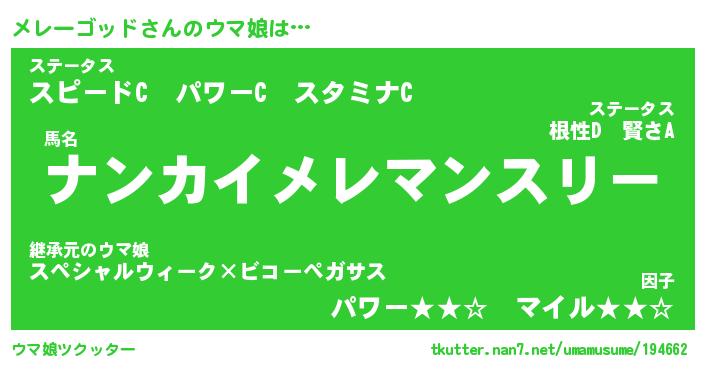 | ヒーロー風カッコイイあだ名 | 『スーパーメレーゴッド』『銀牙騎士メレ』 |