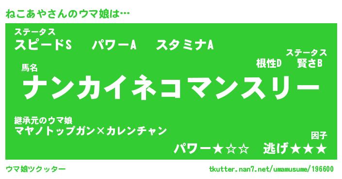 | 欧米人風あだ名 | 『マイケルねこあや』『ウサインねこあや』 |