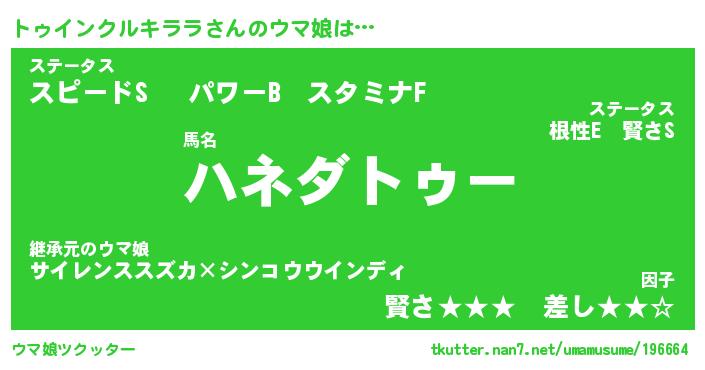 | 欧米人風あだ名 | 『マイケルトゥインクルキララ』 |