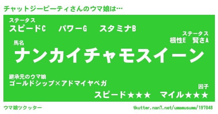 | 伝説のあだ名 | 『不死鳥のスナイパーチャットジーピーティ』 |