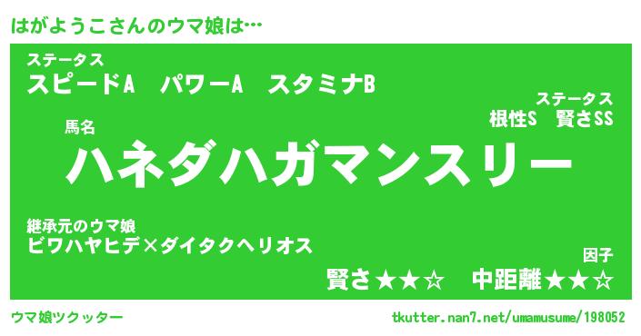 | 自動車の名前っぽいあだ名 | 『ハガティマ』『ハクア』『ハント』 |
