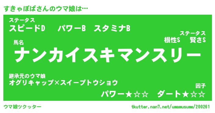 | 欧米人風あだ名 | 『マイケルすきゃぽば』 |