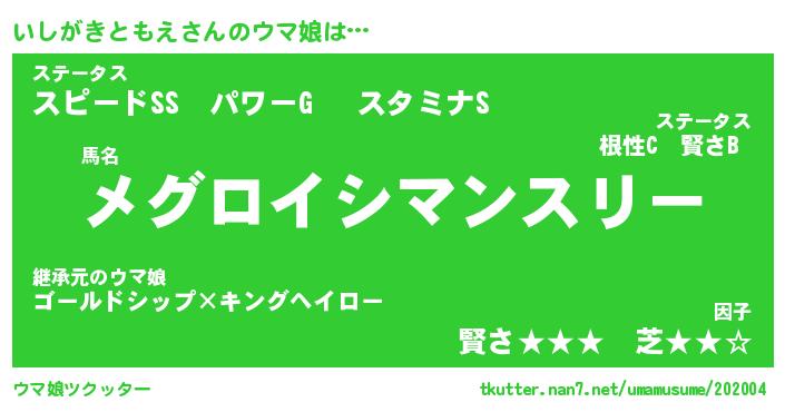 | 胡散臭い通販商品みたいなあだ名 | 『必ず成功する霊験あらたかなお札…その名も「いしがきともえ」』 |