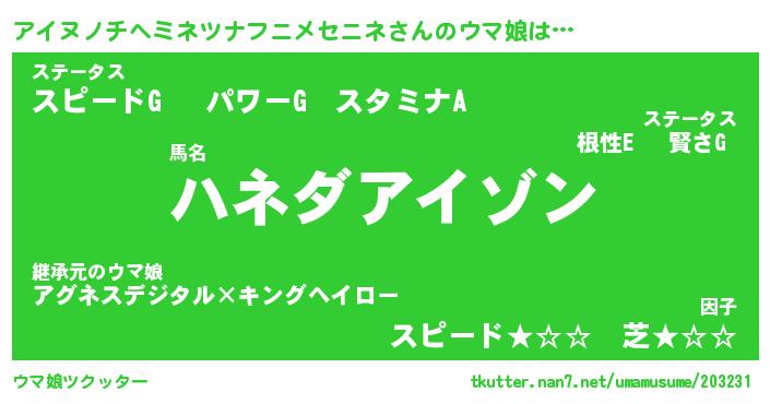 | 欧米人風あだ名 | 『マイケルアイヌノチヘミネツナフニメセニネ』 |