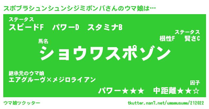 | 男性向けラノベタイトル風あだ名 | 『スポブラシュンシュンシジミボンバの憂鬱』 |