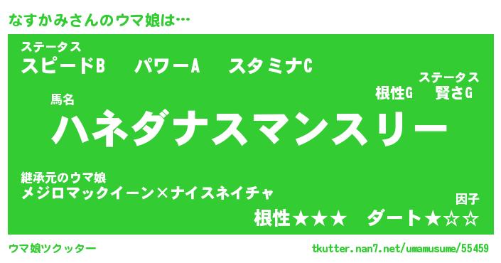 | 欧米人風あだ名 | 『マイケルなすかみ』『ウサインなすかみ』 |