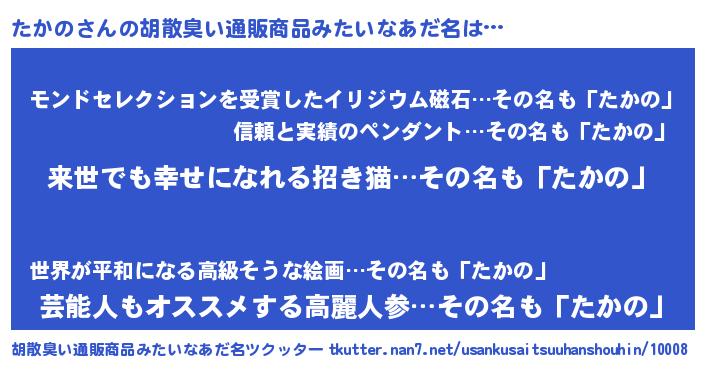 | 意味不明あだ名 | 『永久保存たかの』『つくし科たかの属』 |