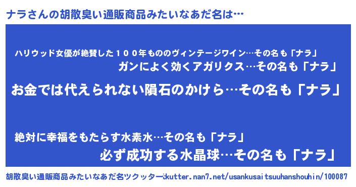 | 女子向けラノベタイトル風あだ名 | 『ナラ恋絵巻』『首の姫と首なしナラ』 |