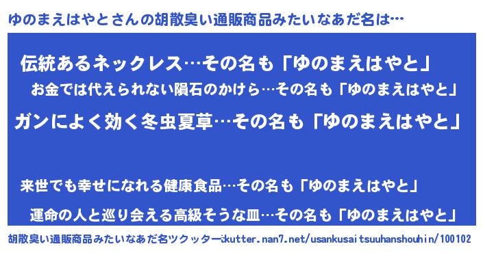 | 肩書あだ名 | 『ゆのまえはやと総統』 |