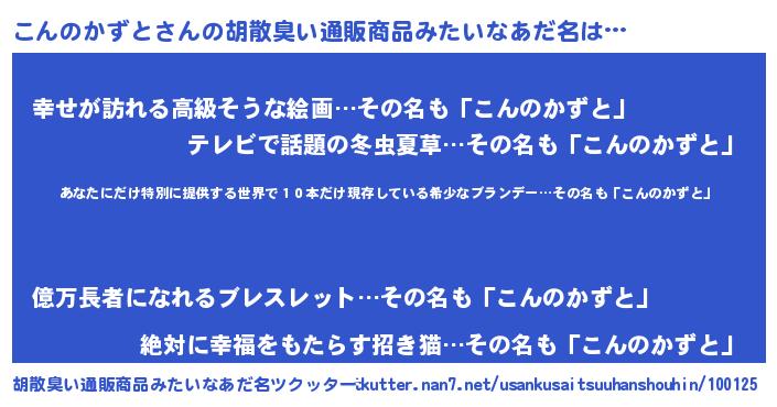 | 男性向けラノベタイトル風あだ名 | 『この素晴らしい世界にこんのかずとを!』 |