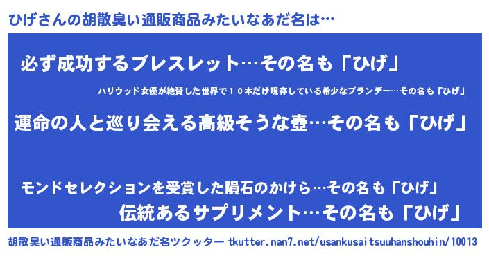 | 男性向けラノベタイトル風あだ名 | 『ひげに滅ぼされるだけの簡単なお仕事です』 |