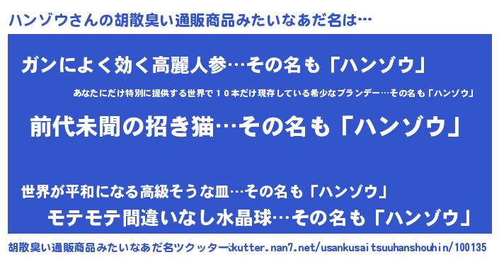| ヘコむあだ名 | 『ハンゾウ(笑)』『ハンもー』 |