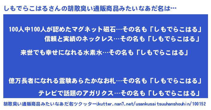 | ヘコむあだ名 | 『しもでらこはる(震え声)』『しもを』 |