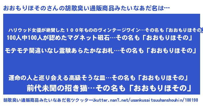 | 男性向けラノベタイトル風あだ名 | 『おおもりほそのの憂鬱』 |