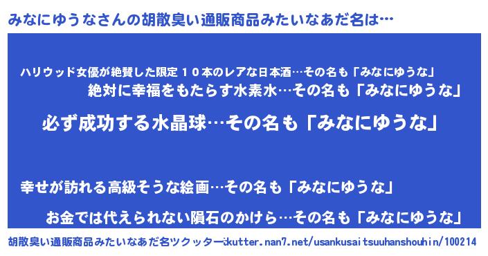 | ヘコむあだ名 | 『みなにゅー』『みなにゆうな(爆)』 |