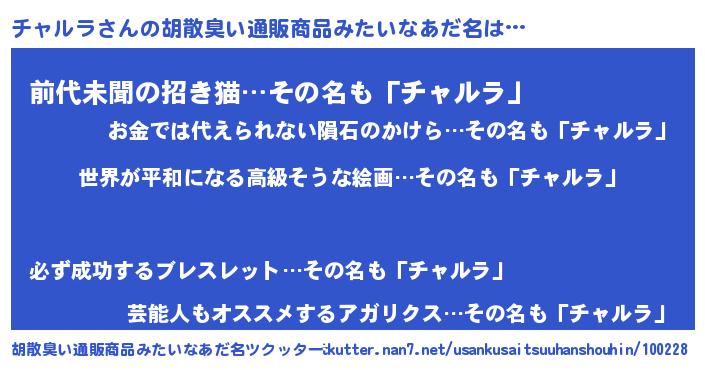 | 男性向けラノベタイトル風あだ名 | 『転生したらチャルラだった件』 |