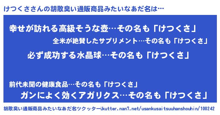 | 男性向けラノベタイトル風あだ名 | 『けつくさの憂鬱』『ケツクサスレイヤー』 |