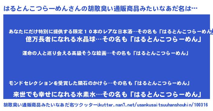 | ヒーロー風カッコイイあだ名 | 『ウルトラはるとんこつらーめんマン』 |