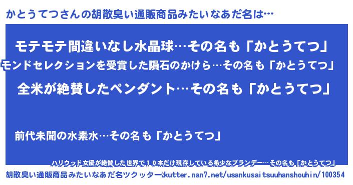 | 男性向けラノベタイトル風あだ名 | 『かとうてつの嫁は女の子じゃないと思った?』 |