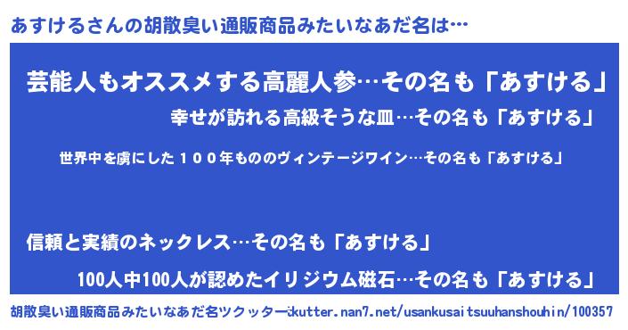 | 意味不明あだ名 | 『住所不定無職あすける(1歳)』 |