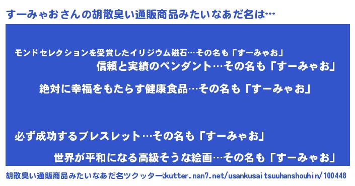 女子向けラノベタイトル風あだ名 | 『異世界で失敗しない100のすーみゃお』 |