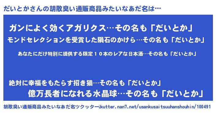 | 男性向けラノベタイトル風あだ名 | 『この素晴らしい世界にだいとかを!』 |
