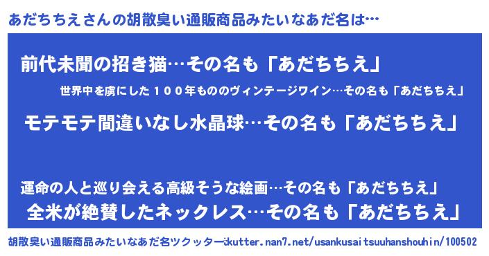 | 女子向けラノベタイトル風あだ名 | 『あだちちえ姫と円卓の騎士』 |