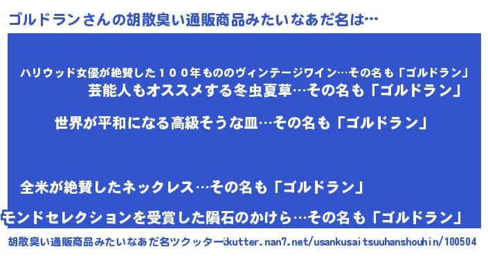 | 男性向けラノベタイトル風あだ名 | 『転生したらゴルドランだった件』 |