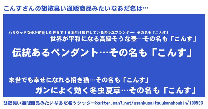 | 女子向けラノベタイトル風あだ名 | 『こんすの卵を拾いまして』 |