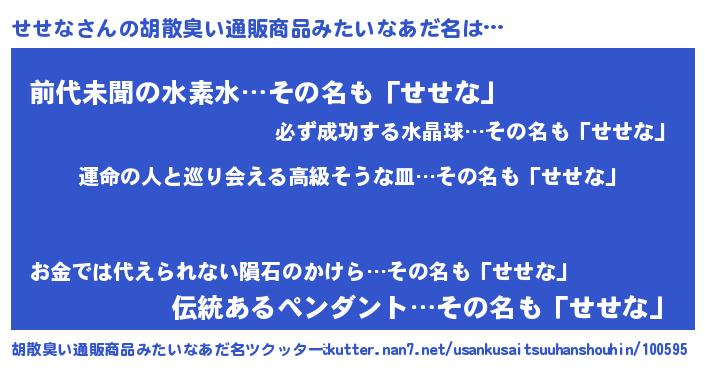 | ヒーロー風カッコイイあだ名 | 『ウルトラせせなマン』『ネオセセナ』 |
