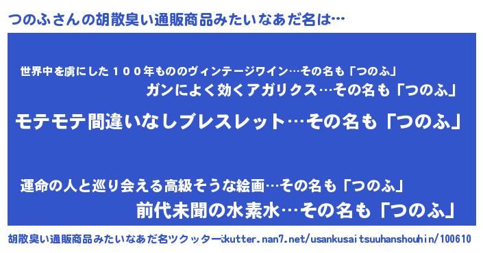 | 女子向けラノベタイトル風あだ名 | 『つのふの玉の輿計画!』 |
