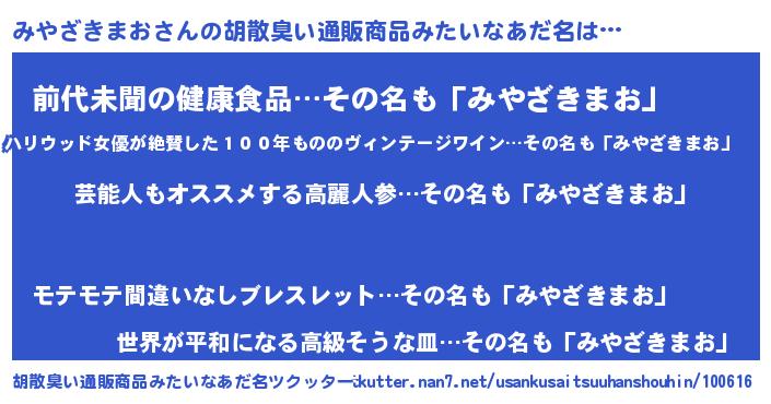 | ヘコむあだ名 | 『みやざきまお(小並感)』『酢こんぶ』 |